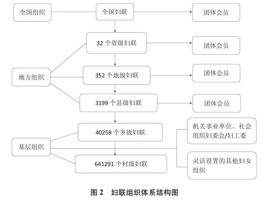 建立健全妇联组织作为党和政府联系妇女群众桥梁纽带的工作机制。全国妇联是各族各界妇女为争取进一步解放与发展而联合起来的群团组织,是中国共产党领导下的人民团体,目前已形成由全国、省(区、市)、市(地、州)、县(市、区)、乡镇(街道)、村(社区)六级妇联组织,机关事业单位、社会组织的妇女委员会或妇女工作委员会,以及团体会员构成的组织体系(图2),同时,新领域新业态新阶层新群体中的妇联组织覆盖不断拓展。在党的领导下,妇联组织依照章程,切实担负团结引导各族各界妇女听党话、跟党走的政治责任,切实履行代表和维护妇女权益、促进男女平等和妇女全面发展的基本职能。围绕党和国家工作大局,广泛深入宣传党的理论路线方针政策,团结引导广大妇女坚定不移走中国特色社会主义妇女发展道路,充分发挥在社会生活和家庭生活中的独特作用,为中国特色社会主义事业建功立业。全国妇联作为成员单位参与中央农村工作领导小组、中央精神文明建设指导委员会、中央全面依法治国委员会守法普法协调小组、国务院扶贫开发领导小组和国务院就业工作领导小组等的工作,反映妇女利益诉求,代表妇女参与国家和社会事务的民主决策、民主管理和民主监督。全国妇联牵头成立“双学双比”和“巾帼建功”活动领导小组、“五好文明家庭”创建活动协调小组、维护妇女儿童权益暨平安家庭创建协调机制等,通过跨部门合作共同推动妇女事业发展。党的十八大以来,妇联组织通过改革创新,进一步增强政治性先进性群众性,充分发挥党开展妇女工作最可靠、最有力的助手作用,坚持用中国特色社
